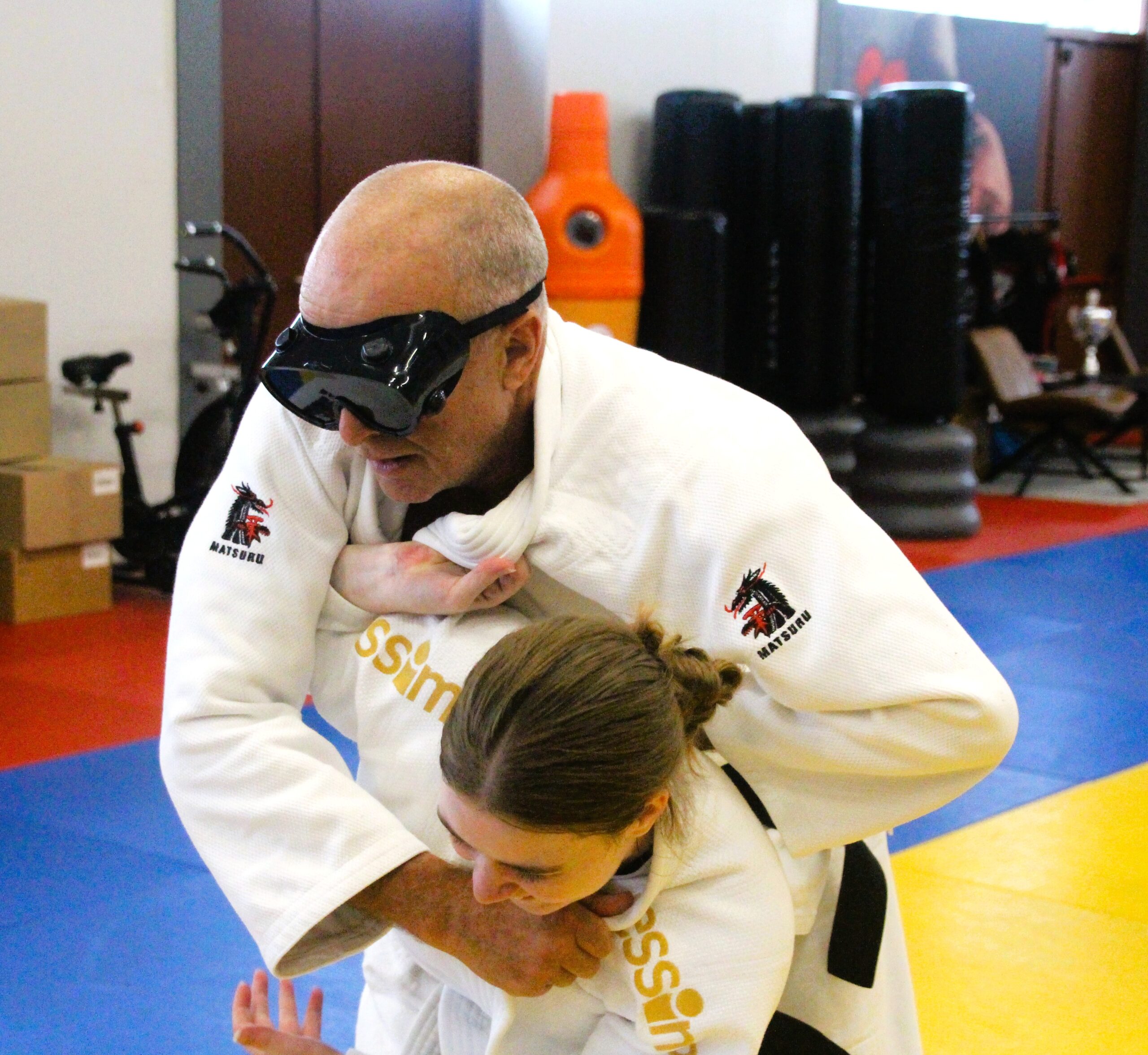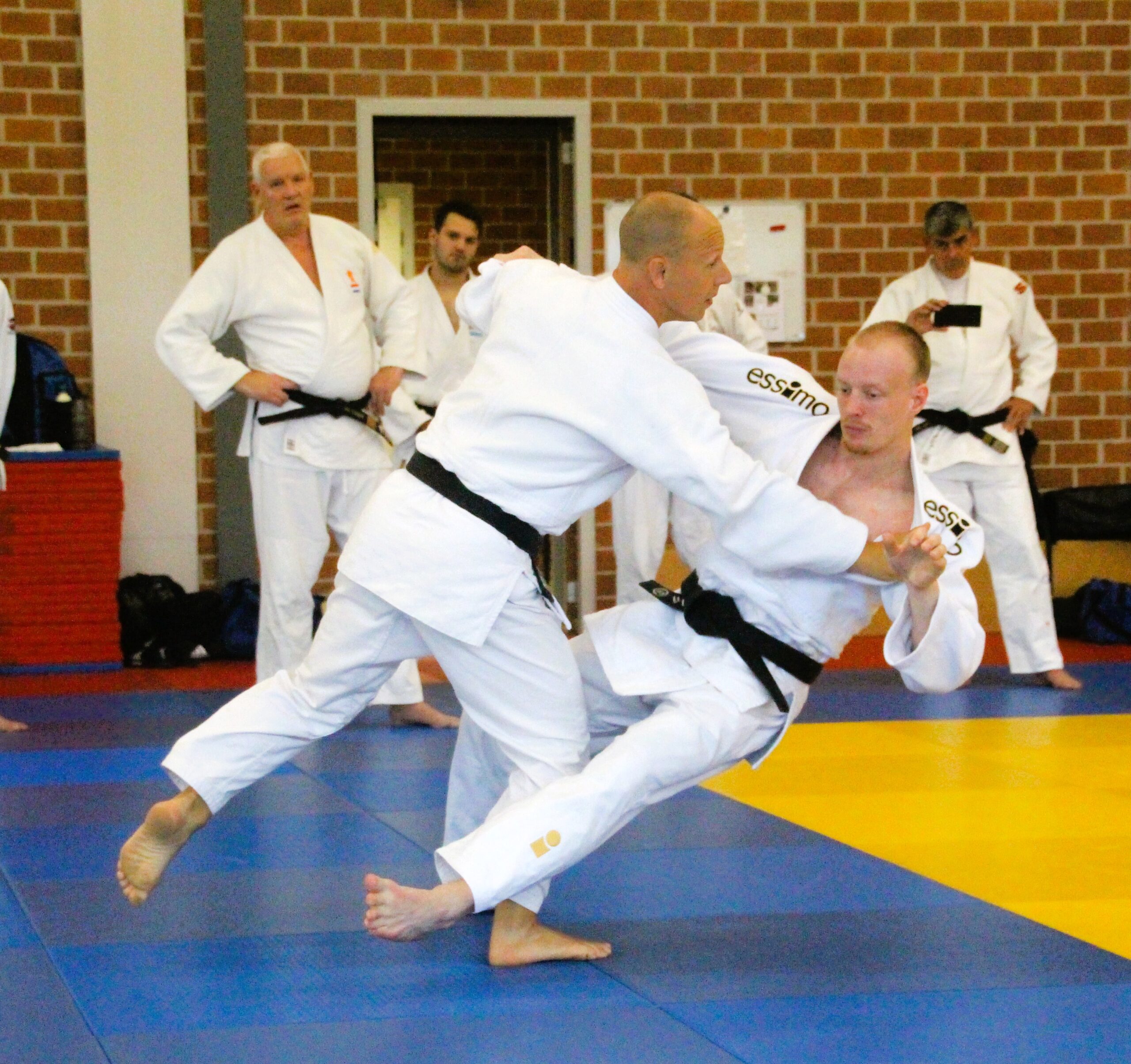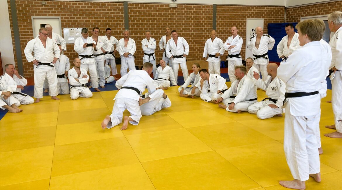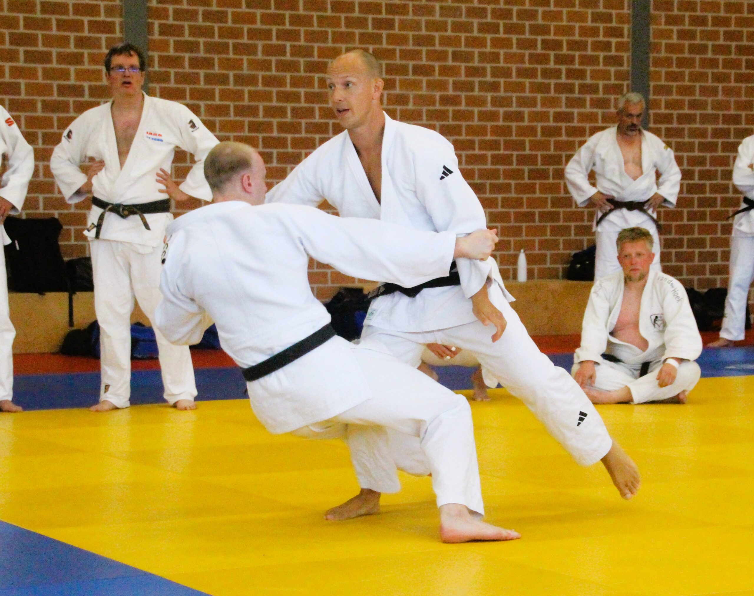 Na de pauze nam Tom Gerkema het tweede blok voor zijn rekening. Hij trainde de groep in het verschil tussen uitlokken en combinaties, met als uitgangspunt de techniek O-uchi-gari. Een technische les waarin de nadruk lag op: “Wat doe ik? Hoe doe ik het? En vooral: wanneer doe ik het?” Om het effect van uitlokken te ervaren, liet Tom de deelnemers werken met een ‘blinderingsbril’, waardoor ze beter konden voelen wat een O-uchi-gari in gang zet.