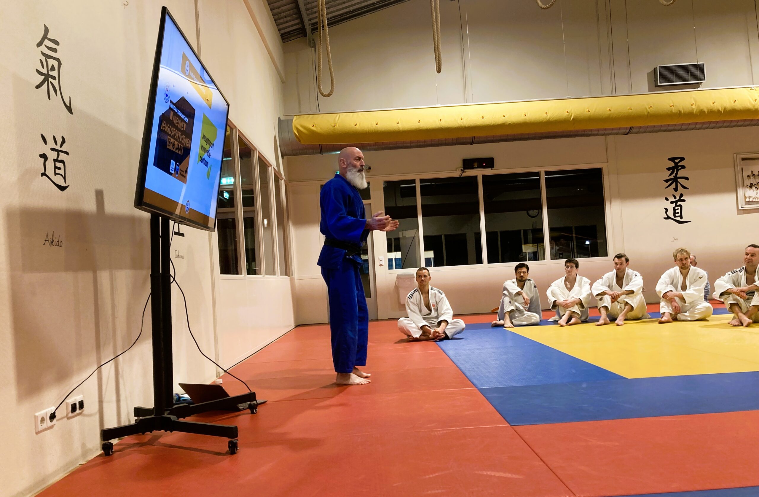 Tijdens het tweede uur van de training voor judodocenten en jeugd-judoleiders gaf Engbert Flapper een inspirerende toelichting op de mogelijkheden binnen het JBN‑project Judoplayground. Dit project richt zich op het creëren van een laagdrempelige, plezierige competitie voor judoka’s van 6 tot 13 jaar.